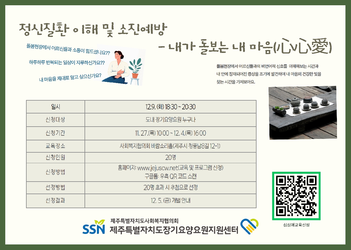 * 일시 : 2025. 12. 9.(화) 18:30 ~ 20:00 * 대상 : 도내 장기요양요원 * 장소 : 사회복지협의회 바람소리홀(제주시 청풍남 8길 12-1) *모집인원 : 20명 * 신청기간 : 2025. 11. 27.(목) 10:00 ~ 12. 4.(목) 16:00 * 신청방법 : 구글 폼, 홈페이지 접수 * 선정방법 : 20명 초과 시 추첨방식으로 진행 * 선정결과 : 12. 5.(금) 개별 알림 |