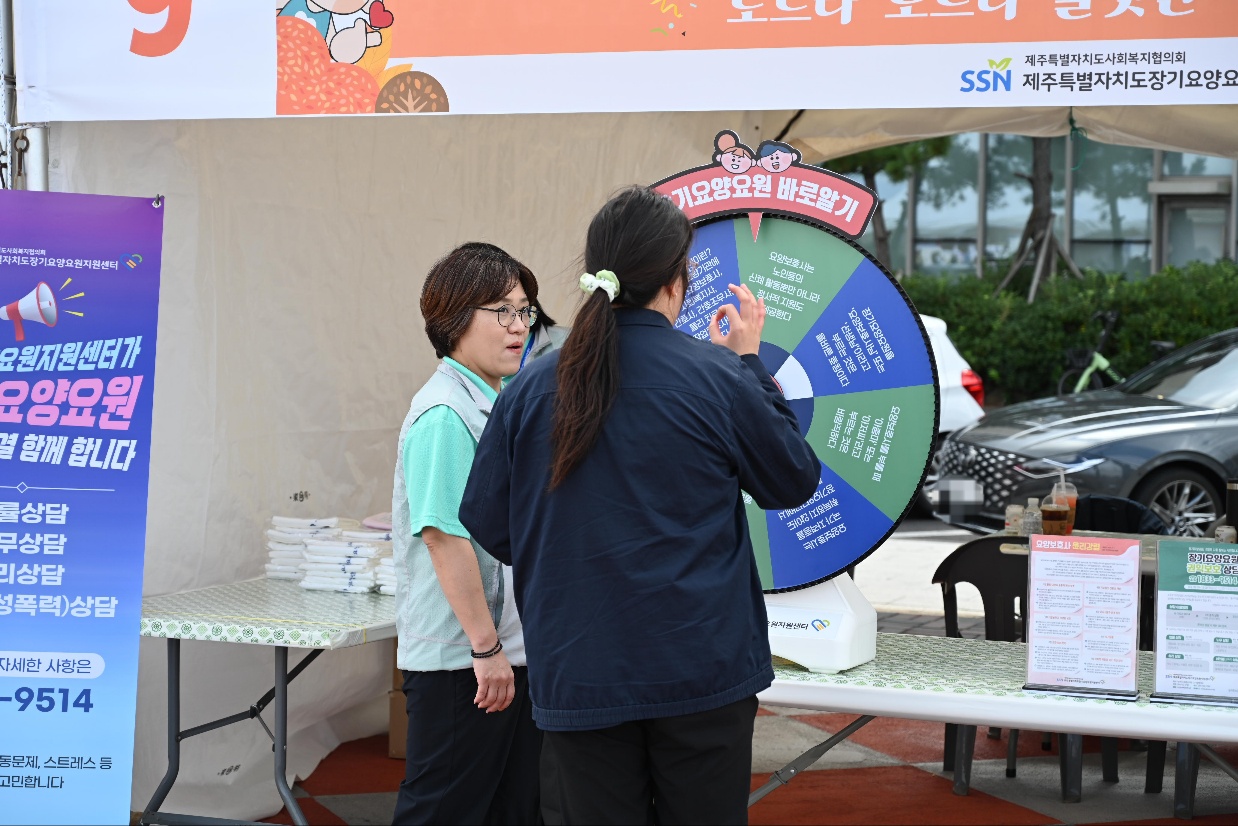 ‘도르라 도르라 룰렛판~ 장기요양요원 인식개선 팡!팡!’ 운영 부스에서 도민들은 룰렛을 돌리고 OX 퀴즈를 풀며 요양보호사의 소중한 역할과 중요성, 장기요양서비스에 대한 이해를 함께 배우는 시간을 가졌습니다. 이번 캠페인에는 650여 명의 도민이 참여해 즐겁게 배우고 돌봄 종사자에 대한 존중과 감사의 마음을 나누는 따뜻한 소통의 장이 되었습니다. 아름답고 존중받는 노년, 우리 모두 함께 만들어가요. |