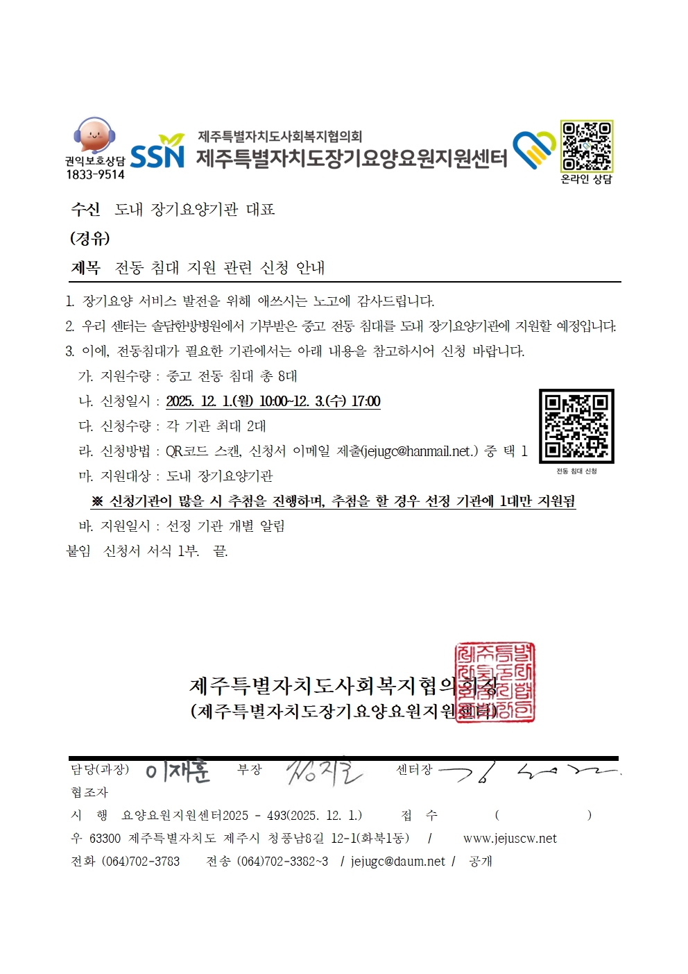 신청방법 : QR코드 스캔, 신청서 이메일(jejugc@hanmail.net) 제출 지원대상 : 도내 장기요양기관 신청수량 : 각 기관 최대 2대 지원일시 : 선정 기관 개별 알림 ※ 신청기관이 많을 시 추첨을 진행하며, 추첨을 할 경우 선정 기관에 1대만 지원됨 |